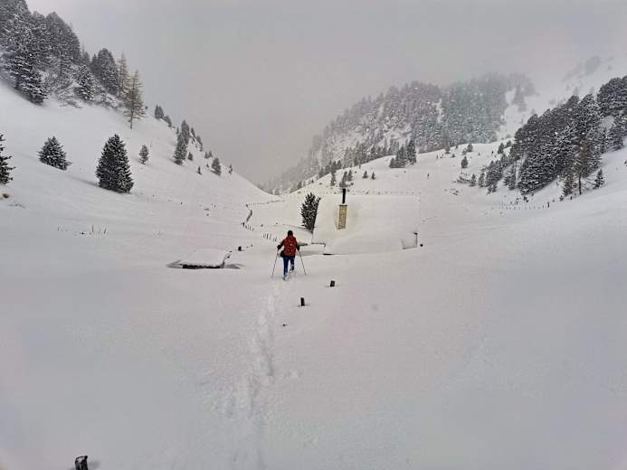 Es geht besonders bequem los, denn die Sechsersesselbahn auf den Kornock (2.193m) verfügt über beheizte Sitze. Nach einem kurzen Abstieg auf der Piste gelangt man an jene Stelle, an der man am Vortag die Skipiste erreicht hat. Von hier geht man entlang der Aufstiegsspuren vom Vortag über die Winkleralm bis in den Talgrund (1.700 m), und steigt dann – wieder vorbei an der Pregathütte - bis in die Pregatscharte (1.920 m) auf.