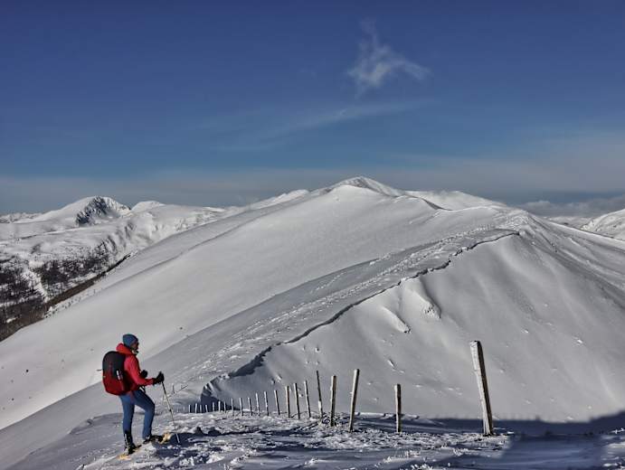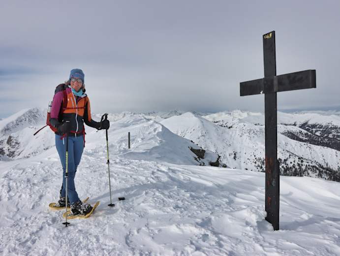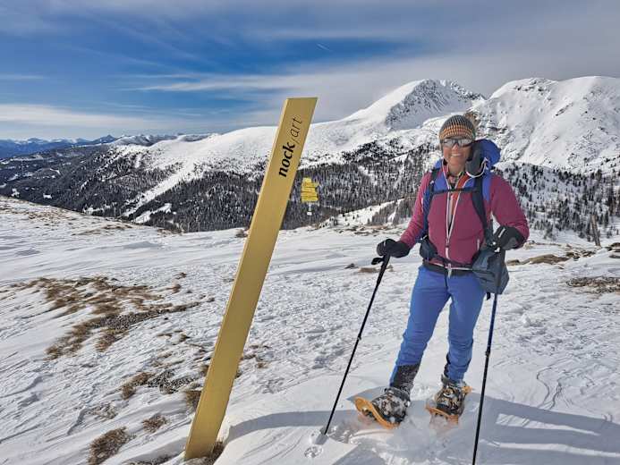 Der letzte Tag am Nockberge-Schneeschuh-Trail in Kärnten führt vom kleinen Skigebiet Falkart über einen aussichtsreichen Höhenrücken bis zur Bergtation der Brunnach Bahn bei St. Oswald.