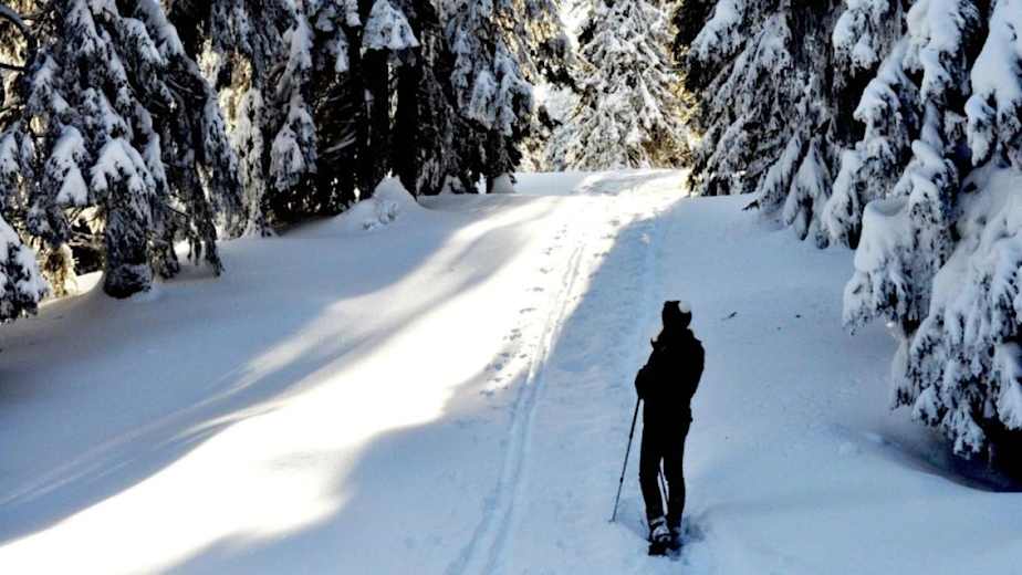Vom Ausgangspunkt auf der Hochebene führt diese einfache Rundtour im Uhrzeigersinn zuerst entlang des Winterwanderwegs bis zur Talstation des Skilifts. Nach einem kurzen Aufstieg dem Lift entlang, taucht der ebene Weg hinein in eine idyllische, weisse Waldlandschaft.