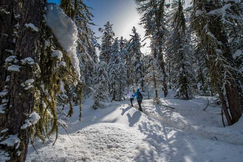 Diese einfache Schneeschuhtour bei Pontresina im Engadin in Graubünden führt durch einen märchenhaften Wald. Endpunkt ist Celerina, weshalb sich die Anreise mit öffentlichen Verkehrsmitteln anbietet.