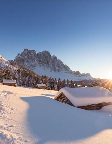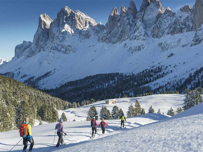 Ein wunderschöner Aufstieg durch den Winterwald im Naturpark Puez-Geisler in Südtirol, vom weltbekannten Kirchlein St. Johann in Ranui bis zum Adolf-Munkel-Weg am Fuße der Geislerspitzen und bis zur Geisler Alm.