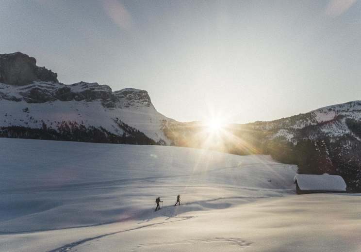 Der krönende Abschluss dieser mittelschwierigen Schneeschuhwanderung ist eine Abfahrt mit der Rodel bis nach Ranui.