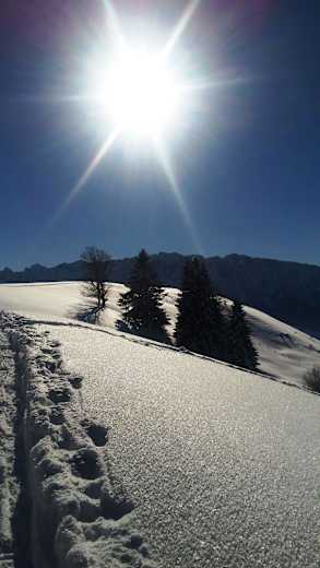 Schneeschuhwanderung von Schwendt im Kaiserwinkl in Tirol auf die im Winter geschlossene Kohlalm. Ausgangspunkt ist der Parkplatz Kohlalm.