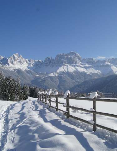 Diese technisch einfache Schneeschuhwanderung in Tiers am Rosengarten in Südtirol eignet sich optimal für Anfänger und Familien. Der Startpunkt befindet sich in St. Zyprian am Parkplatz Weißlahnbad.