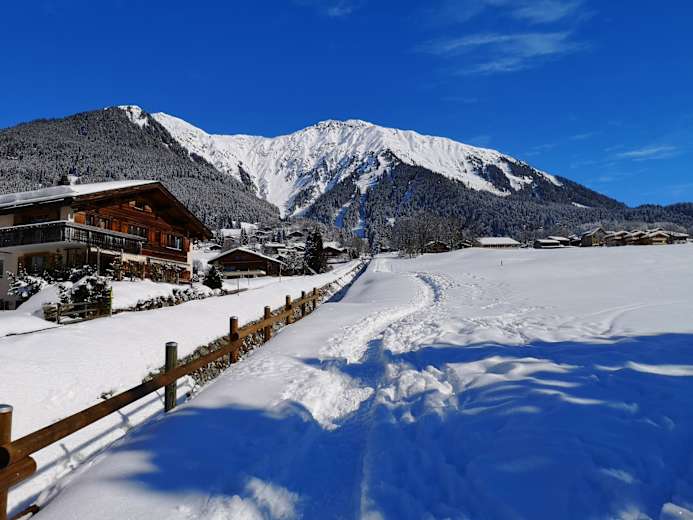 Gestärkt geht es hinab zu Riedmad und anschliessen wieder leich hinauf bis zum Talbach. Im letzten Abschnitt führt der Trail entlang des Talbachs zurück an den Startpunkt, wo nach ca. 2.15 Stunden die schöne Schneeschuhtour endet.