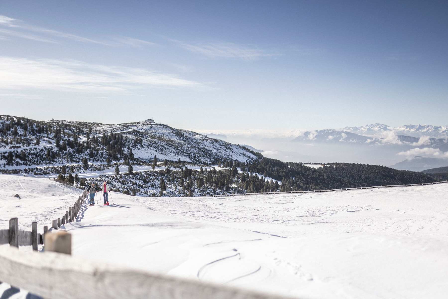Die Schneeschuhe schnallen wir uns etwa100 m vor dem Parkplatz Pemmern (1.540 m) beim Lärchhof an und folgen der Spur, die dem Weg (Mark. Nr. 24) folgt. Nach etwa 400 m erreichen wir die Wegkreuzung mit dem „Hirtensteig" (Mark. Nr. 1 A). Hier biegen wir scharf links ab und durchqueren den Wald bis kurz unterhalb der nicht bewirtschafteten Unterkunft der Rittner Hirten, der Saltner Hütte (1.664 m).