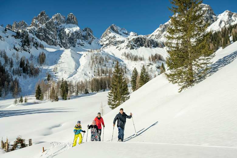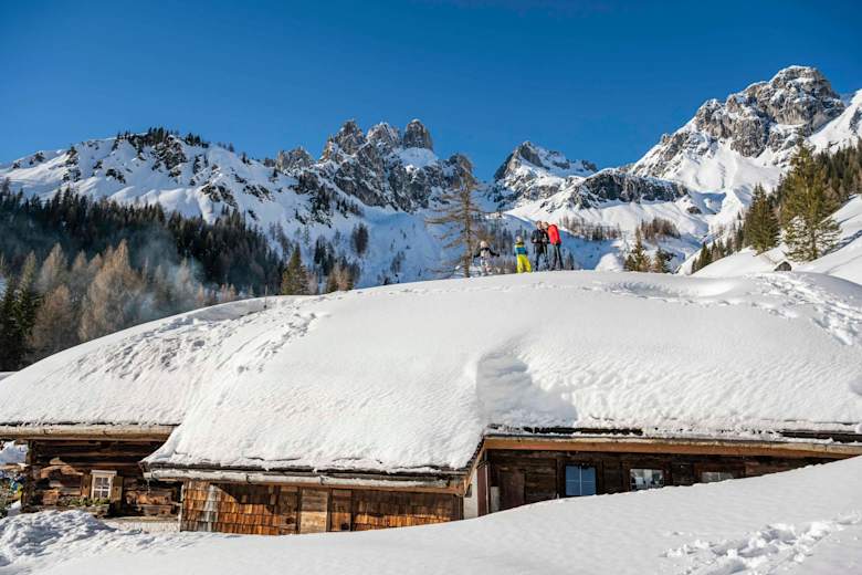 Eine wunderschöne, leichte Schneeschuhwanderung im Angesicht der Bischofsmütze bei Filzmoos im Salzburger Land. Die Tour zu den Hofalmen könnte malerischer kaum sein. Ausgangspunkt ist der Parkplatz Mautstelle Hofalmen.