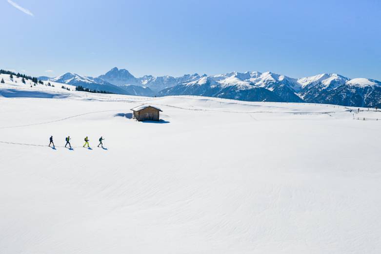 Eine herrliche Tour am Lüsner Kamm mit prächtigem Panoramablick führt vom Weiler Ellen im Pustertal hinauf zum Astjoch (2.194 m). Die Schneeschuhwanderung gehört zu den lohnendsten dieser Gegend. Beeindruckend ist der herrliche Ausblick auf die Pfunderer Berge und die hellen Dolomitengipfel.