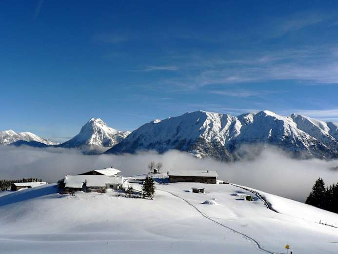 Schöne, mittelschwere Schneeschuhwanderung ausgehend von Achenkirch am Achensee in Tirol. Die Tour führt über Forststraßen und Wiesen aufwärts zur aussichtsreichen Falkenmoosalm.