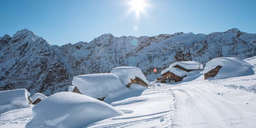 Beim Aufstieg zwischen majestätischen Lärchen werden Sie die typischen “Gadumschi” und andere charakteristische Bauten entdecken, die den flüchtigen Blicken der Skifahrer, die sich die schneebedeckten Pisten hinunterstürzen, entgehen.