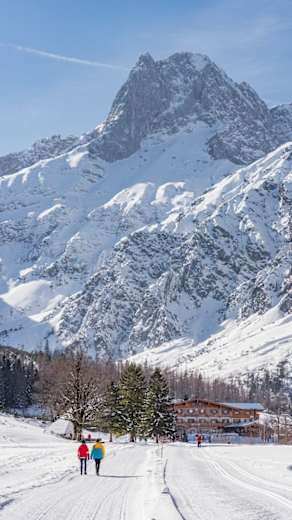 Wunderschöne Schneeschuhwanderung in Tirol: Von Pertisau am Achensee führt der Weg durch den verschneiten Winterwald zur Falzthurnalm und weiter nach hinten zur Gramai Alm im Karwendel, zwei Einkehrmöglichkeiten mit gemütlichen Stuben und wunderbaren Tiroler Spezialitäten.