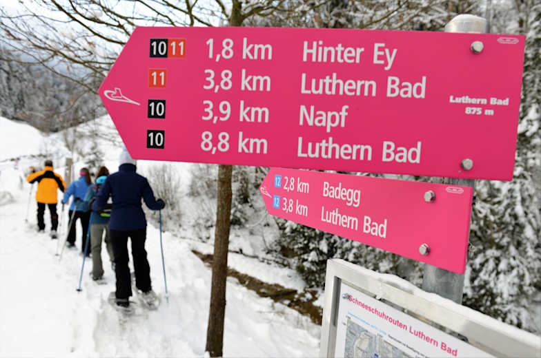 Die anspruchsvolle Schneeschuhtour von Luthern Bad auf den Napf in der Region Willisau ist sehr aussichtsreich und gut beschildert. Die Tour lässt sich gut mit öffentlichen Verkehrsmitteln unternehmen.