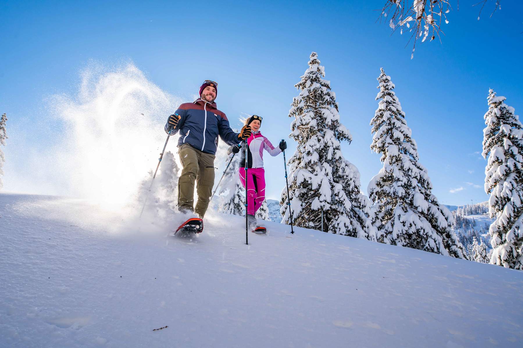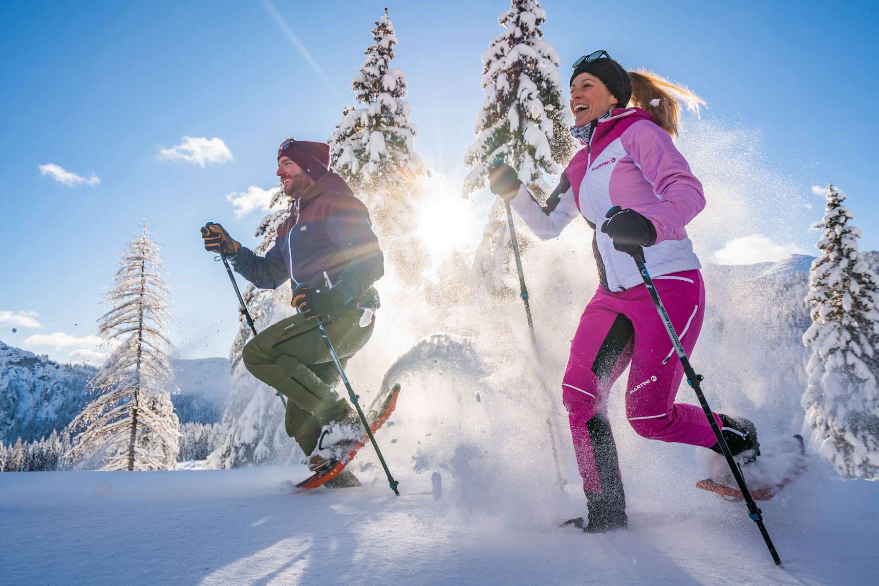 Schneeschuhwandern Egger Alm Foto: Peter Maier, NLW Tourismus Marketing GmbH So viel Spaß kann Schneeschuhwanden machen. Foto: Peter Maier, NLW Tourismus Marketing GmbH Mit Schneeschuhen und Husky in der Winterlandschaft auf der Egger Alm unterwegs. Foto: Peter Maier, NLW Tourismus Marketing GmbH Bildergalerie (3)