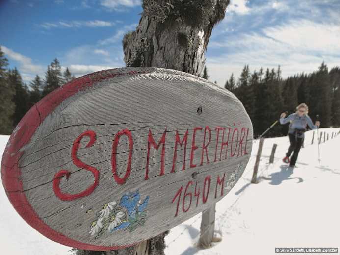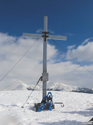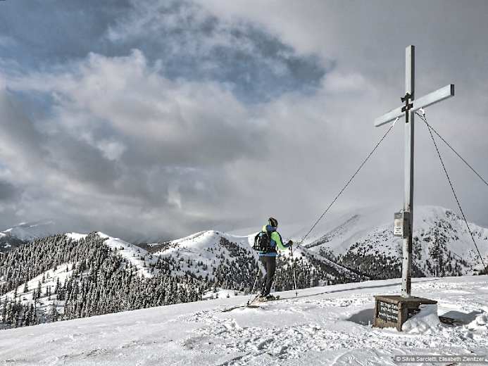 Der Abstieg erfolgt im Gipfelbereich gleich rechts von der Aufstiegsspur. Nur wenige Meter vom Gipfelkreuz entfernt, zweigt der Wanderweg rechts in den Wald ab. Wir sollten hier unbedingt auf die Markierungen an den Bäumen achten, da sich südlich des Gipfelbereichs steiles, abschüssiges Gelände befindet. Wir folgen dem Wanderweg, bis wir zu einer Holztafel mit der Aufschrift „St. Oswald“ kommen, hier gehen wir links auf den Wanderweg 988 und erreichen wieder unsere Aufstiegsspur. Die Forststraße kürzen wir jetzt aber über die Wiese ab, bis wir am Wiesenende wieder auf die Straße stoßen. Kurz vorm Sommertörl halten wir uns links und steuern auf die freien Wiesenflächen rund um die im Winter geschlossene Sommerhütte, 1.591 m, zu. Über die Wiese geht es weiter bis zum Forstweg, dem wir nach rechts folgen, bis wir wieder zu unserer Aufstiegsspur gelangen. Wer noch seine eigenen Spuren im Schnee ziehen will, sollte kurz vorm Parkplatz die Forststraße verlassen und die verschneite Hochebene über einen unter der Schneedecke mäandrierenden Bach ausgehen.