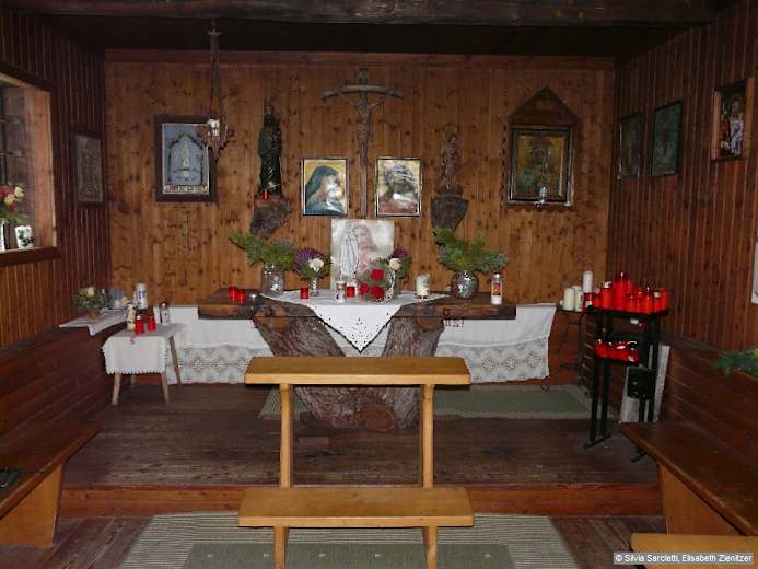 An der kleinen Holzkirche Maria Loretto, 1817 m, werfen wir einen Blick in den kleinen Kirchenraum, wo wir auch die Möglichkeit haben, uns in ein Buch einzutragen. Foto: Silvia Sarcletti, Elisabeth Zienitzer, Bergverlag Rother GmbH