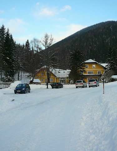 Die Abfahrt von der Klinkehütte erfolgt entweder über den Steilhang oder über die im Winter nicht geräumte Forststraße bis zurück auf die Kaiserau, wo wir einen Einkehrschwung in der Sportalm machen.