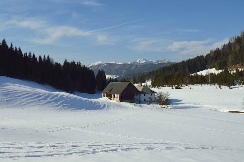 Hier links abbiegen (Beschilderung Luchstrail folgen) und bergab über die Egglreith zur Rotkreuz Kapelle absteigen. Weiter führt die Route dem Rotkreuz Bach, leicht fallend, Richtung Laussabaueralm (im Winter nicht bewirtschaftet) entlang. Die Laussabaueralm links liegen lassen und zur Hengstpassstraße weiter vorgehen. Auf Höhe einer Aussichtsplattform vom Nationalpark Erlebnisweg "Von Alm Zu Alm" ist die Hengstpass-Landesstraße zu überqueren. Gegenüber geht es auf einem Ziehweg etwas bergauf - dieser verläuft sich dann im Almboden welcher Richtung Westen zu queren ist. Nach einer halben Stunde ist auch schon das Gebäude der Puglalm (im Winter nicht bewirtschaftet) in Sicht. Hinter dem Stallgebäude führt der Weg weiter leicht ansteigend auf einen kleinen Hügel von welchem man tolle Ausblicke auf die umliegende Bergwelt genießen kann. In wenigen Meter steigt man wieder zur Hengstpass-Landesstraße ab und nimmt gegenüber auf der Forststraße, den kurzen Abstieg Richtung Rotkreuzkapelle in Angriff. Die Almrunde schließt sich hier. Der Rückweg zur Hengstpasshütte führt über den schon bekannten Proviantweg Richtung Egglalm und über den Güterweg zum Ausgangspunkt.