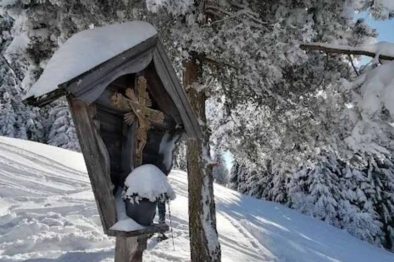 Nach einem Marterl mit Bank geht es wieder eher in den Wald bis zum Prädasten Niederleger. Die Skitourenspur führt unter dem Niederleger ziemlich gerade nach oben. Schneeschuhgeher können auf der Forststraße bleiben. An der Alm wandert man in vielen Serpentinen stetig bergauf, durch Waldstücke und Wiesenflächen - bis zum Hochleger der Prädasten Alm.