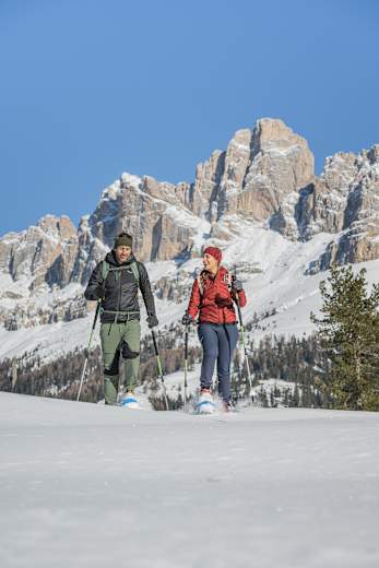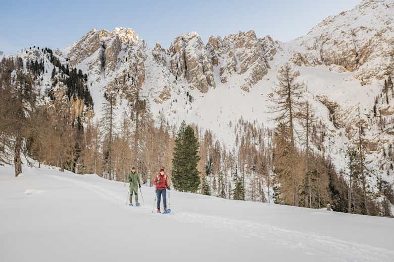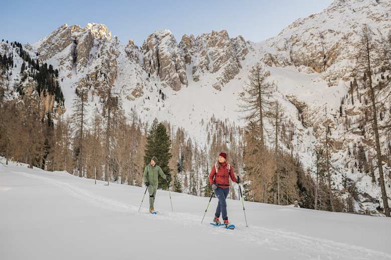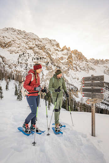 Schneeschuhe und Stöcke sind in Carezza und Obereggen vor Ort erhältlich.