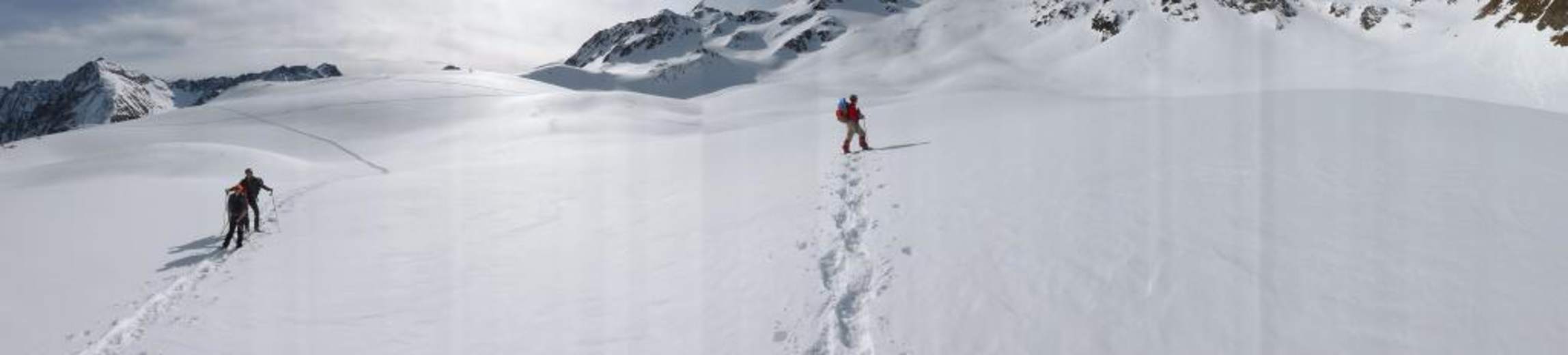 Die schöne Gipfelkulisse mit Sonnenwände, Zwiselbacher Grießkogel, Samerschlag, Metzerstein sind beeindruckend. Nachdem die ersten Anhöhen im Roßkar genommen sind geht es in das Gleirschkar erst mäßig dann Steil bergauf. Wir bleiben im Roßkar an der linken Flanke um der Gefahr die von den Wechten zwischen Gleirschjöchel und Gleirsch Roßkogel ausgeht zu meiden. Der nach Norden ausgerichtet Hang hat oft nur eine geringe Schneebedeckung. Um es einfacher durch das Steinkar zu gestalten gehen wir senkrecht nach oben.