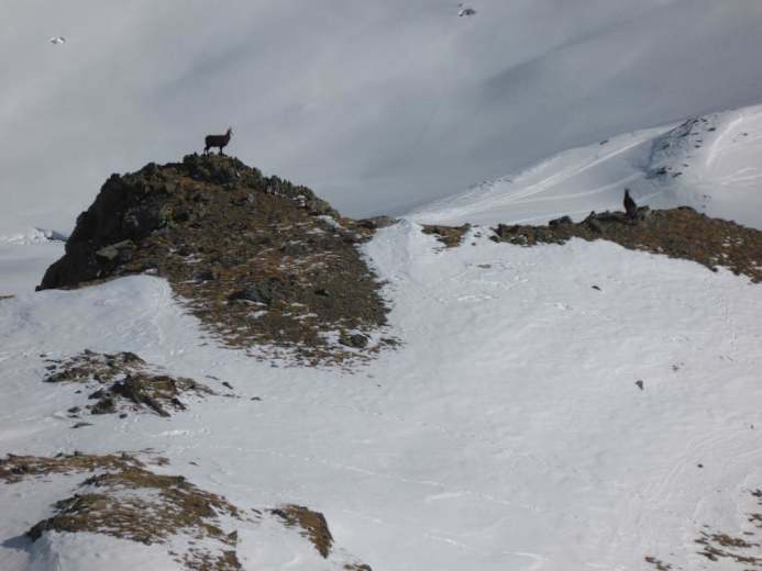 Ein Rudel Gämse hat uns fest im Blick, aber sie lassen sich nicht nennenswert stören. Bald ist der steile Aufschwung überwunden und es geht flacher zum Joch vor dem letzten Gipfelanstieg. Da die erste Schneeschicht sehr hart ist, beschliessen wir ohne Schneeschuh weiter zugehen und mit dem Pickel entsprechende Stufen zu schlagen.