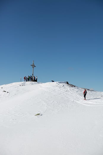 Den gemütlichen Platz unter dem riesigen Holzkreuz verlässt man dann nordostwärts und steigt, wieder den Kamm entlang, hinab zum Klenkboden. Von diesem flachen Sattel geht es rechts ab auf Weg 38 über weite Almböden zur bewirtschafteten Taistner Vorderalm. Der Weg 38 A führt von der Alm zum Parkplatz zurück. Er ist im Winter bei Rodlern und Böcklfahrern beliebt, darf aber auch von Fußgängern und Skitourengehern benutzt werden. Allerdings ist Vorsicht geboten. Mit Schneeschuhen kann man den ersten Rodelbahn-Kurven ausweichen, indem man durch den Wald quert und etwas abkürzt.