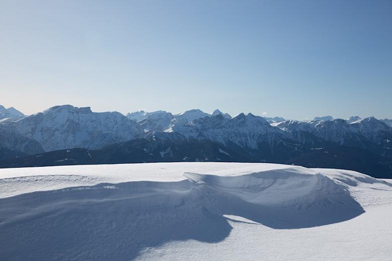 Schneeschuhtour vom Mudlerhof über den Durakopf (2.276 m) zur Taistner Alm: Zuerst durch den Fichtenwald und dann über die Waldgrenze mit malerischem Panorama über die Gipfelkette der umliegenden Villgratener Berge. Lohnende Tour aus dem Gsiesertal in Südtirol.