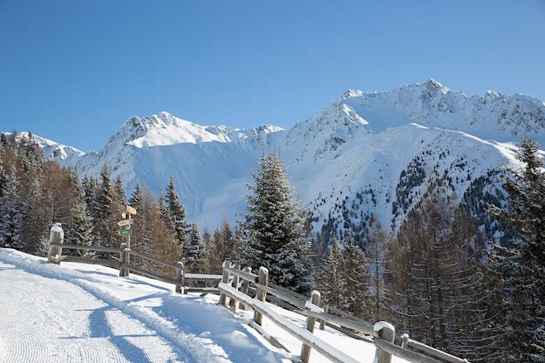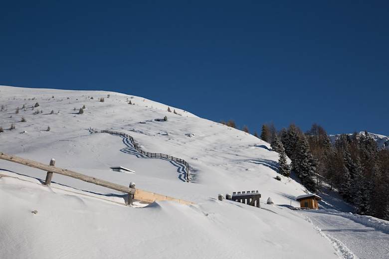 Schneeschuhtour durchs Pfoital auf die Uwaldalm und auf den Spielbühel (2.398 m): Von St. Magdalena im Gsiesertal marschiert man am Pfoibach entlang und erreicht schließlich die Uwaldalm. Lohnende Tour in den Villgratener Bergen in Südtirol.