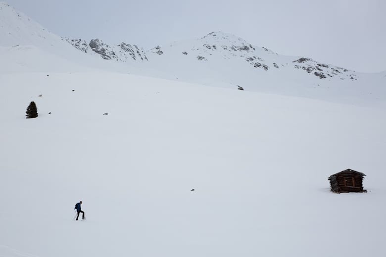 Schneeschuhtour über die Aschtalm zur Pfinnalm: Durch das Pfinntal erreicht man bald die Pfinnalm mit malerischem Ausblick auf das Fellhorn und den Hohen Mann. Lohnende Tour in den Villgratener Bergen in Südtirol.