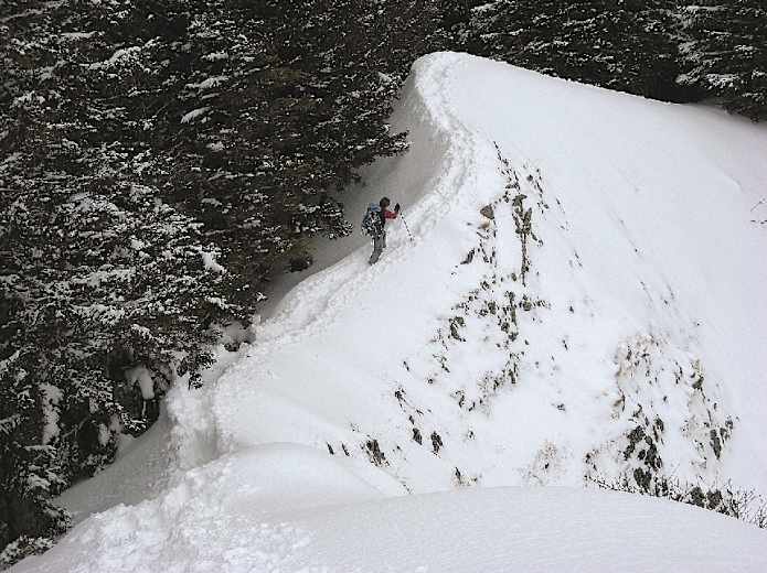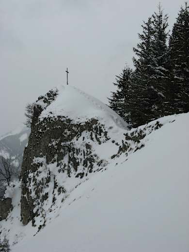 Wieder im Freien reckt sich vor uns der Felsen des Rehleitenkopfes in den Himmel. Wir deponieren unsere Schneeschuhe am Waldrand und gehen zu Fuß über den schmalen Grat und die letzten steilen Meter hinauf zum Gipfelkreuz.