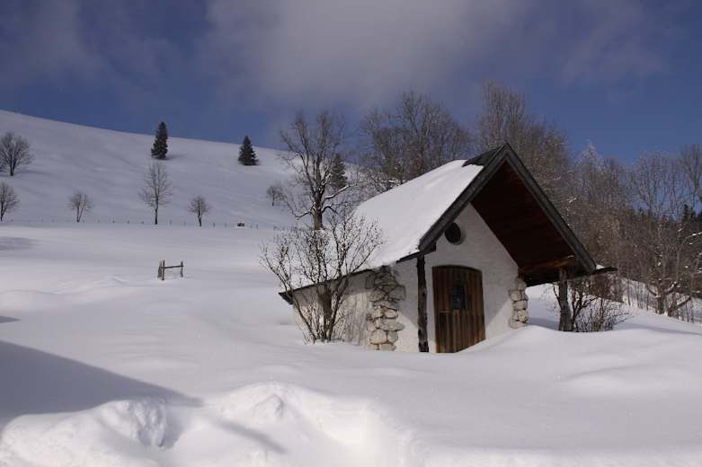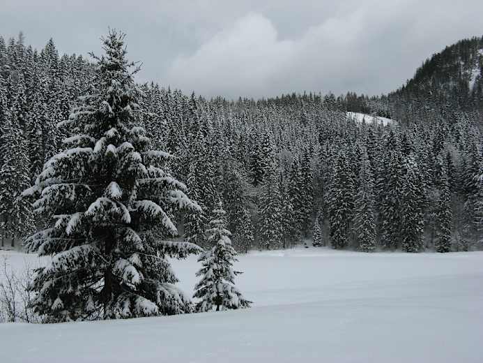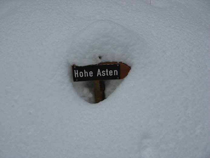 Kurz nachdem rechts ein Weg abgezweigt ist, kommen wir zum tief verschneiten Bichlersee, 955 m. Unser Weg führt links am See entlang und wieder in den Wald. Nun folgt eine kurze, etwas heikle Passage: Wir queren ansteigend einen steilen Waldhang (Achtung auf Schneerutsche) zu einem Felsen. Hier wird der Weg kurzzeitig enger, ein Drahtseil hilft über diese ausgesetzte Stelle hinweg. Nun wieder in leichtem Gelände wandern wir in einem großen Linksbogen zu einer Lichtung mit Wegweiser zur Hohen Asten.