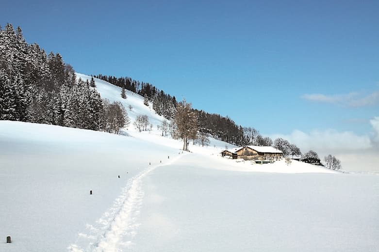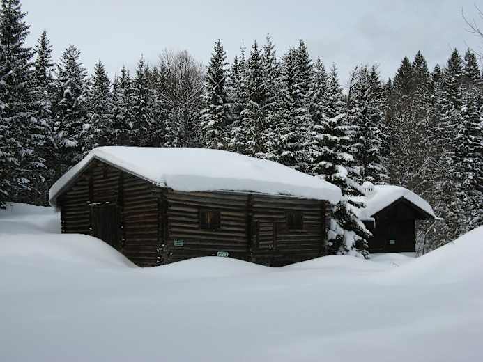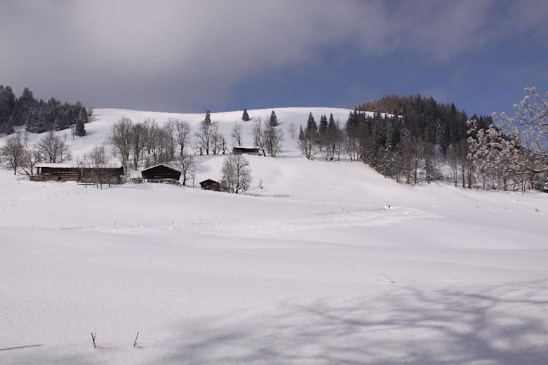 Wir gehen westlich an der Bichler Alm vorbei und entlang eines Stockhangs wieder in den Wald. Nach einer weiteren Lichtung mit herrlichem Blick zum Heuberg passieren wir das nächste Waldstück, kommen zu einer welligen Hochfläche, gehen an einer kleinen Felsnase vorbei und erreichen die Klammalm, 1.140 m, die in tiefem Winterschlaf liegt. Hier beginnt ein breiter Weg, der durch eine schöne Waldschneise und über einen bewaldeten Sattel zu einem Forstweg führt, der von der Sudelfeldstraße heraufkommt (Abstiegsmöglichkeit). Auf ihm wandern wir geradeaus, verlassen ihn bei der nächsten Wegteilung nach rechts und gelangen an den Rand einer Lichtung.