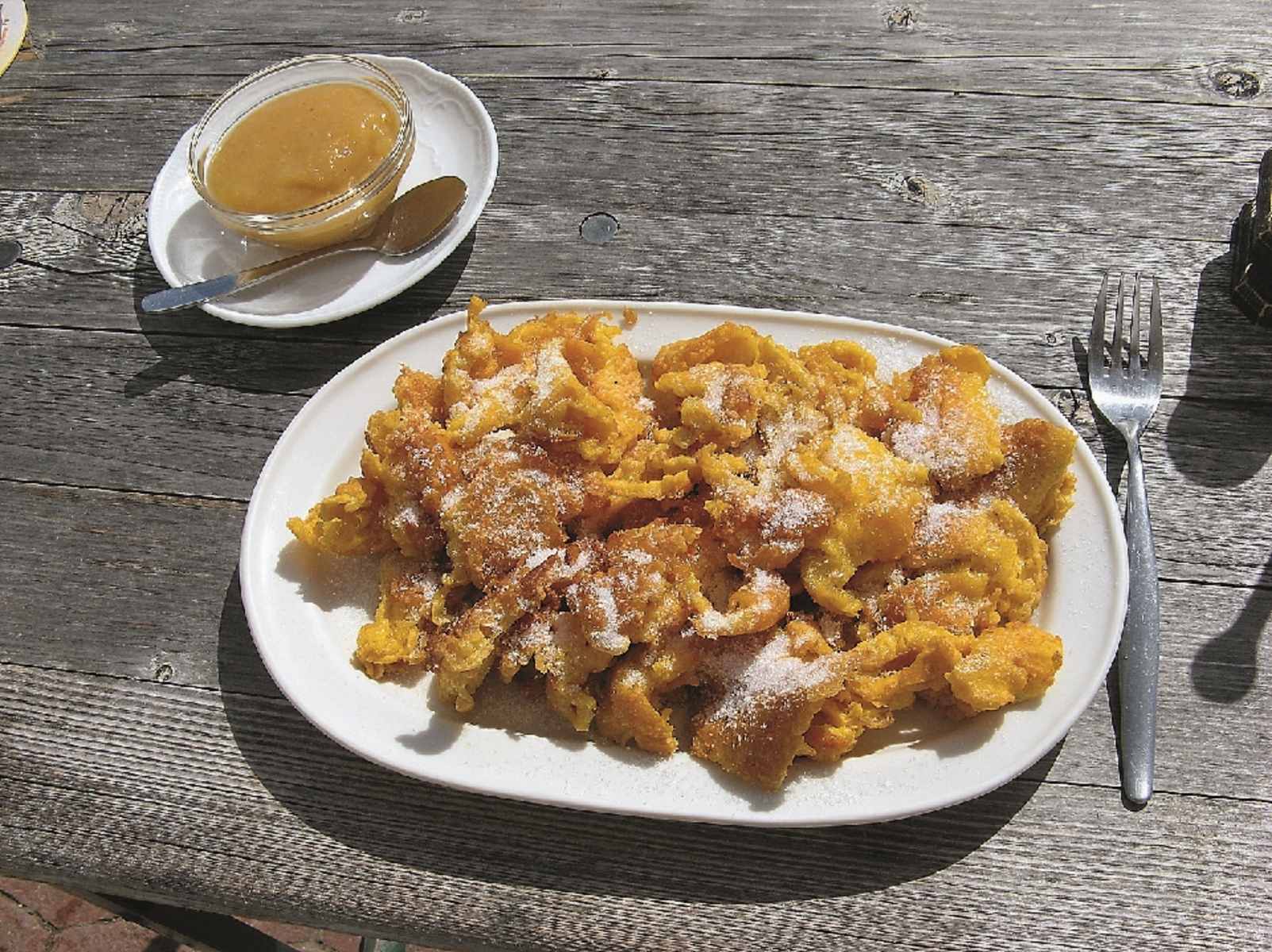 Nach dem Gipfelsieg über die Weißwürste wartet dann auf der ganzjährig bewirtschafteten Esterbergalm noch eine Nachspeise auf uns: ein lockerer, luftiger, goldgelber Traum von einem Kaiserschmarrn.