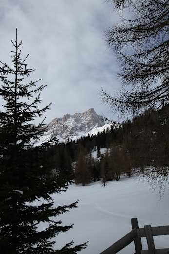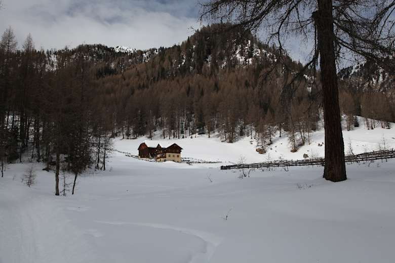 Vom Parkplatz gehen wir auf der als Rodelbahn geräumten Almstraße taleinwärts, am Pareshof vorbei, zu einem riesigen Felsblock, 1630 m; hier zweigt unsere Spur rechts ab. Anfangs auf breitem Weg, dann entlang des mit 5 markierten Sommerwegs steigen wir durch zunehmend lichter werdenden Wald bergauf, passieren einen kleinen Graben und einen Stadel und gelangen wieder auf die Rodelbahn, die wir jedoch kurz darauf wieder nach links verlassen.