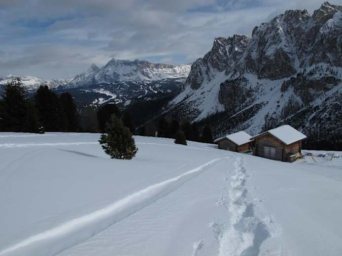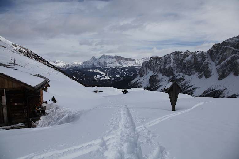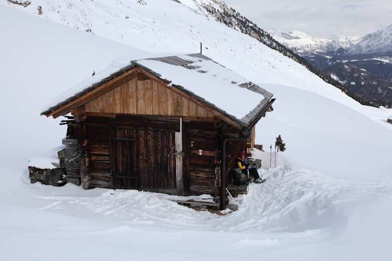 Weiter führt uns die Spur entlang eines bequemen Rückens und in gebührendem Abstand zu den steilen Südhängen der Medalges-Alpe nach Westen, von einem Stadel zum nächsten. Es ist eine genussvolle Wanderung durch eine zauberhafte Landschaft, bis bei einem verfallenden Stadel die Skispuren rechts abbiegen.