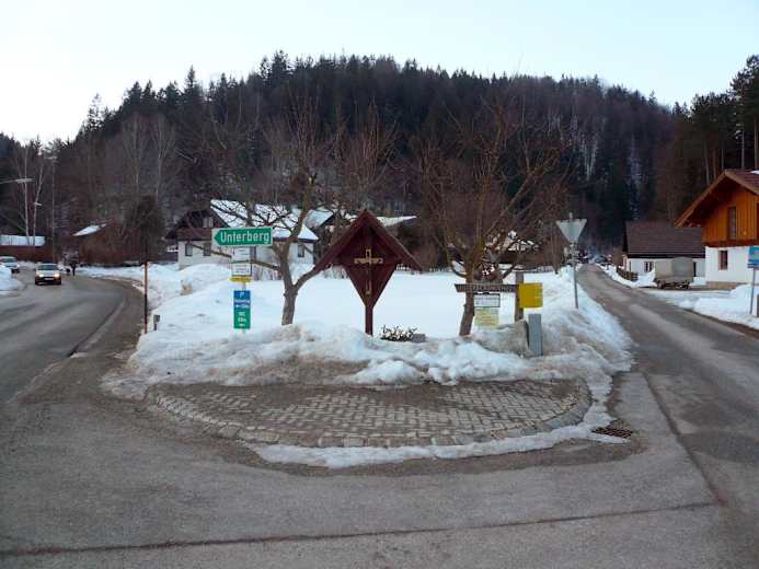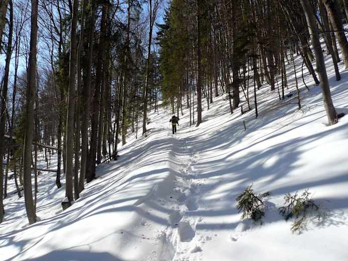 Der Abstieg erfolgt mit Blick auf den Unterberg Richtung Südwesten in einen Sattel auf 983 m. Dort lässt man die Abzweigung in den Viehgraben links liegen und geht nochmals ein Stück bergauf, bis eine Tafel nach links in den Enziansteig leitet. Diesem gut markierten (und meist auch kräftig gespurten) Weg folgt man, anfangs in leichtem Auf und Ab, bis man schlussendlich auf der Straße in Thal ankommt. Von dort in wenigen Minuten zurück zum Parkplatz.