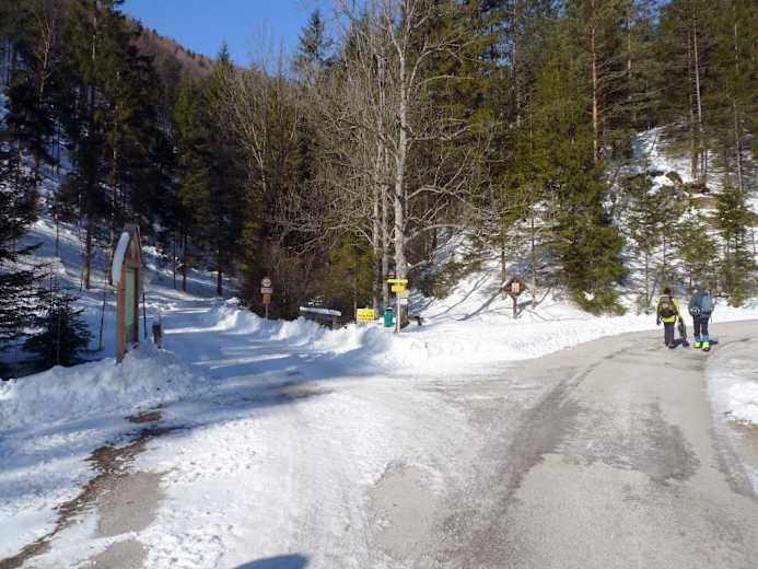 Im Ort Thal wandert man auf der Straße nach rechts den Atzbach entlang Richtung „Kieneck-Enzianhütte“. Die Zufahrt Richtung Atz ist i.a. gut geräumt und je nach Scheelage muss man die Schneeschuhe anfangs etwas in der Hand tragen. Nach gut 500 m kommt links die Abzweigung in den Viehgraben, hier kann man direkt Richtung Kieneck abkürzen.