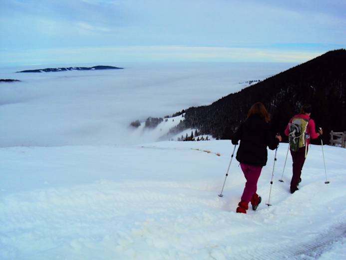 Ab hier geht es - bei wenig Schnee - auf einem schmalen Pfad weiter, der teils am Grat, meist aber etwas südseitig verläuft. Bei guter Sicht liegt das Schweizer Säntismassiv im Rücken, rechterhand reihen sich die Gipfel der Nagelfluhkette und linkerhand schaut man auf Oberstaufen und über das Konstanzer Tal.