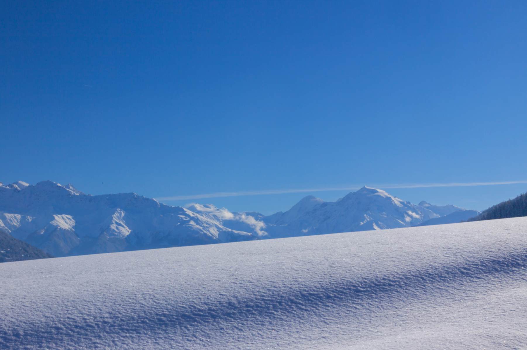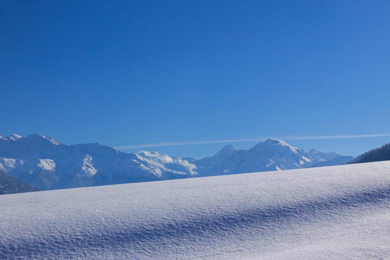 Man folgt der Aufstiegsspur oder gleitet mit den Schneeschuhen durch den weichen Schnee abwärts, indem man sich immer an die Aufstiegsspur orientiert.