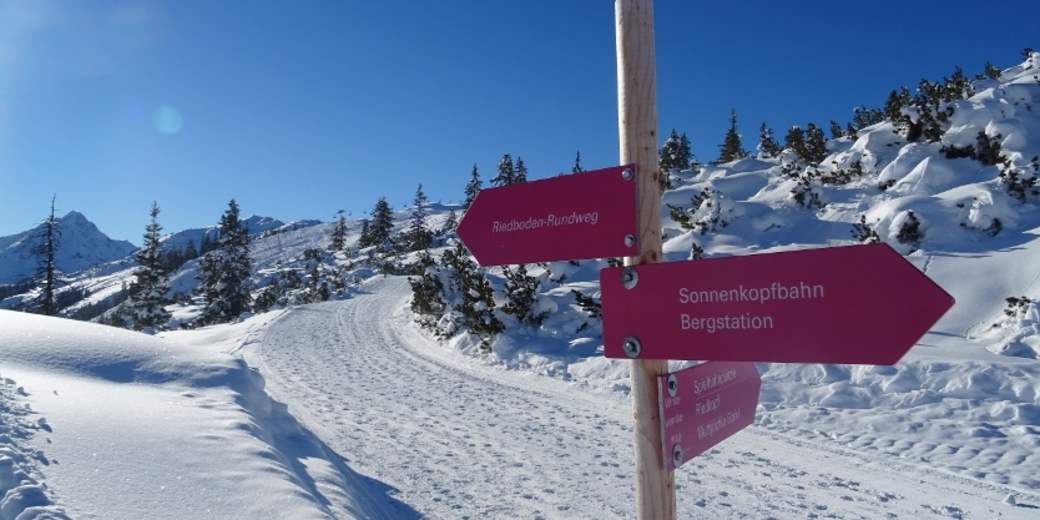 Der Riedboden-Rundweg ist ein leichter, kurzer Rundweg auf präpariertem Winterwanderweg im Skigebiet Sonnenkopf. Start- und Zielpunkt ist die Bergstation der Sonnenkopfbahn. Ab der Bergstation folgen Sie der pinken Winterwanderwegs-Beschilderung "Riedboden-Rundweg".
