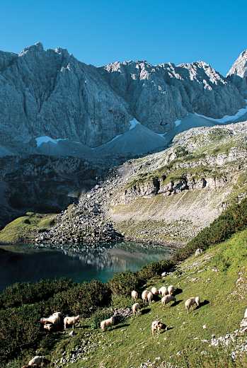 Felsiges Gipfelduo über traumhaften Bergseen: Silbrige Funken sprühen im Gegenlicht über den Drachensee. Vor der zerfressenen Felsmauer des Grünsteins vollführt eine Dohle ihre Flugkunststücke. Eine braune Kugel flitzt mit schrillem Pfiff über Felsblöcke – ein Murmeltier auf der Flucht. Klettersteiggeher arbeiten sich winzig wie Ameisen im steilen Fels des Vorderen Tajakopfs nach oben. Wir sitzen auf einem Wiesenbuckel vor der Coburger Hütte und schauen und staunen. Der Drachensee schmiegt sich in die Mulde unter der Coburger Hütte. Unergründlich wirkt er, fast ein bisschen unheimlich. Um sein Geheimnis weiß die Sage: Ein Drache soll an seinem Grunde hausen und die Bewohner eines versunkenen Dorfes bewachen. Zu sehr hatten diese in Saus und Braus gelebt. In der Geröllwüste des Brendlkars wirkt der glasklare Brendlsee wie eine Oase. Er ist der kleinste im Seentrio, doch die Lust auf viele Schwimmzüge wird selbst Abgehärteten schnell vergehen.