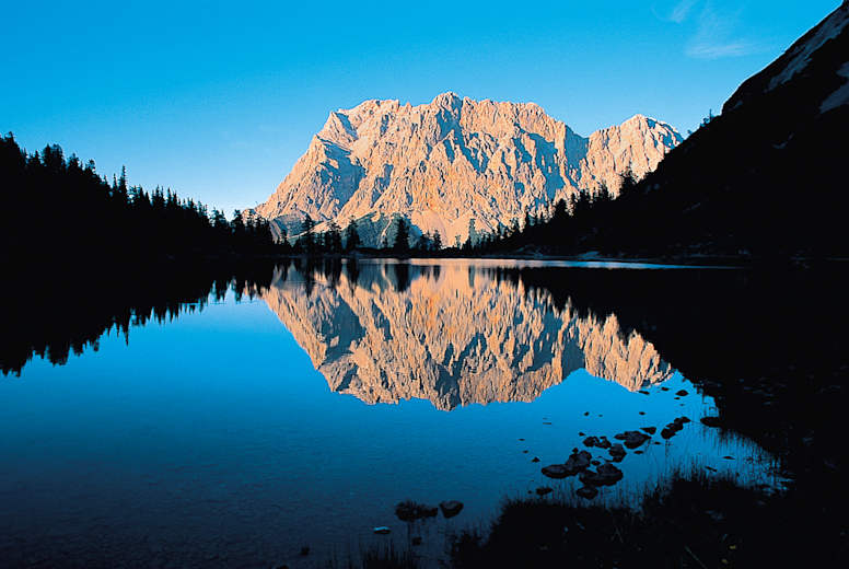 Gleich drei Seen laden bei dieser Runde im Mieminger Gebirge in Tirol zum Abtauchen im eisigen Wasser ein. Der türkisblaue Seebensee ist ein Bergsee wie aus dem Bilderbuch. In seiner Wasserfläche spiegelt sich allerhöchste Bergprominenz: Vom Ufer aus sieht man dem Zugspitzmassiv beim Kopfstand zu.