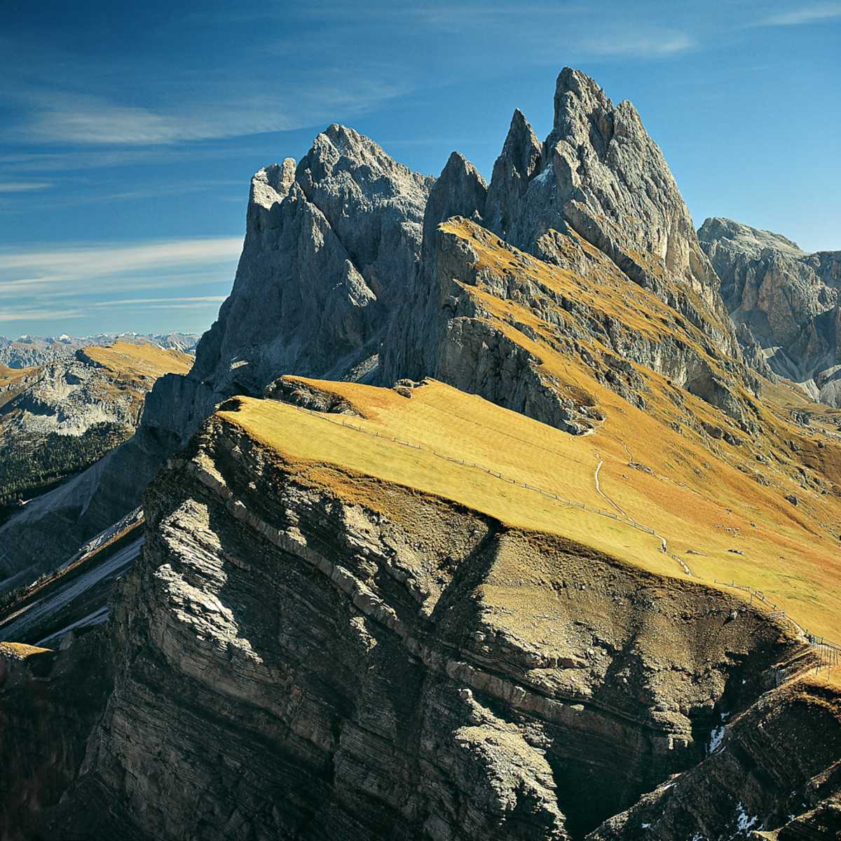 Als Entschädigung wartet eine landschaftliche Sensation in den Dolomiten: der Einblick in die gewaltigen Nordwände der Geislergruppe in Südtirol. Was dann im weiteren Talabstieg noch folgt, ist hindernisloses Schreiten durch eine bezaubernde Parklandschaft.