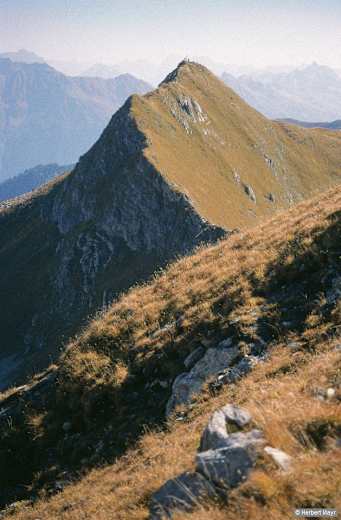 Der Geißspitzsteig (Hätaberger Weg) beginnt mit einem kleinen Gratstück, bevor er unter dem schrofigen Wilden Mann eine steile Bergflanke quert. An der Kreuzspitze vorbeiwandernd kommen wir mit nochmals geringem Abstieg zu einem Sattel, 2.250 m. Hier präsentieren sich die Sulzfluh, die Drei Türme und die Drusenfluh besonders imponierend. Auch der Westgrat auf den Grasgipfel der Geißspitze bereitet keinerlei Probleme. In steilen Pfadkehren steigen wir jetzt über den Südosthang hinunter zur Lindauer Hütte, 1.744 m, an der Waldgrenze. Nach einer Stärkung müssen wir kurz zurück zu einer Verzweigung. Dort wählen wir den flachen Latschätzer Höhenweg. Der Pfad führt zwischen Latschen hindurch, quert eine Gebüschzone und bringt uns durch einen Waldstreifen zur Latschätzalpe, 1.733 m. Nach sanftem Gegenanstieg über Weiden und Alpenrosenhänge schaukelt uns die Gondel von der Bergstation Golm nach Latschau.