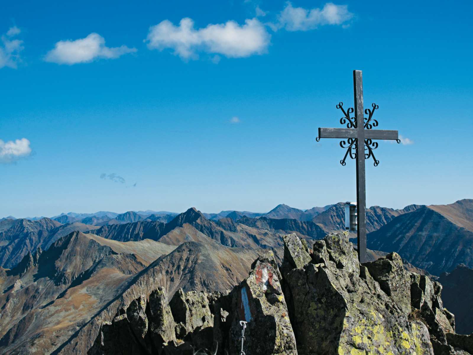 Mit einem Blick 50 Tourenziele erahnen: Die Form dieses Predigtstuhls in den Zentralalpen – österreichweit gibt es 23 Gipfel dieses Namens – ist derart markant, dass seine Identifizierung relativ leicht fällt: Der steirische Gipfelaufbau gleicht einem Stuhl, hoch und hart, dennoch einladend. Er strömt erhabene Ruhe aus; das schmiedeeiserne Kreuz verstärkt den Eindruck.