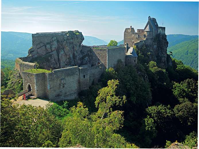 Ruine Aggstein: Ein Wahrzeichen der Wachau! Die auf einer Felsschulter 300 Meter über dem rechten Donauufer stehende Ruine gehörte einst zu den mächtigsten Burgen des Landes. Ihre beherrschende Lage ermöglichte die Kontrolle des gesamten Stromverkehrs. 1100 von Manegold III. von Aggsbach-Werde erbaut, von 1181 bis 1335 im Besitz der Kuenringer. 1429 erwarb Georg Scheck vom Wald („Schreckenwalder“) die Burg, der wie seine Nachfolger Georg von Stein und Ulrich von Grafenegg nach der Sage als Raubritter seine Opfer ausbeutete. Seit 1685 im Verfall.