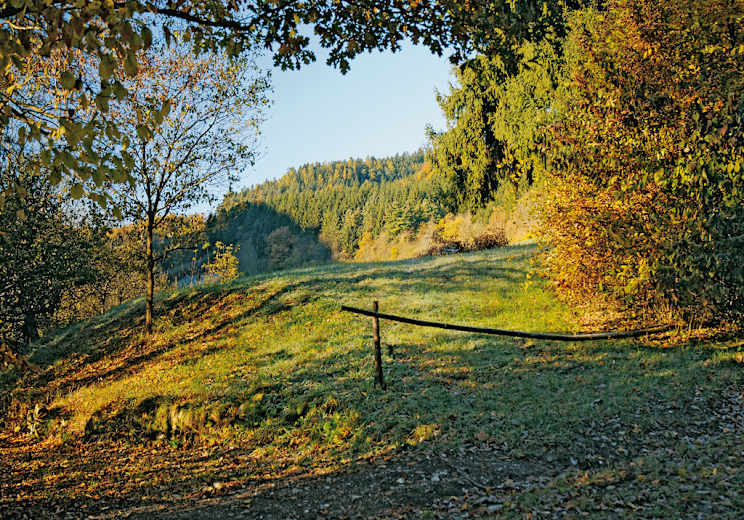 Auf Fahrweg nach links (Osten) in den Wald. Dort über eine Anhöhe (550 m, höchster Punkt der Etappe) hinweg zu den Feldern und Wiesen „Auf der Hülben“ mit Straßengabelung (Hochstand). Rechts den staubfreien „Güterweg Hülben“ nach Süden hinab in den Weiler Mörenz und dort zur Verzweigung am oberen Ortsrand (416 m; Standorttafel).