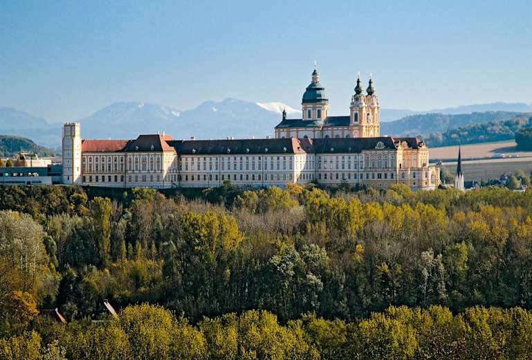 Der grandiose Bau von Stift Melk mit dem Schneeberg im Hintergrund. Foto: Franz Hauleitner