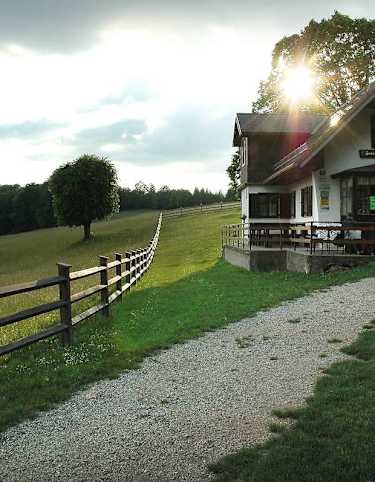 Geradeaus über eine bewaldete Anhöhe hinweg, dann nach rechts hinab in eine Wiesenmulde und dort den Karrenweg Nr. 5/3 am linken Muldenrand abwärts zum Unteren Ramsauhof, 510 m.