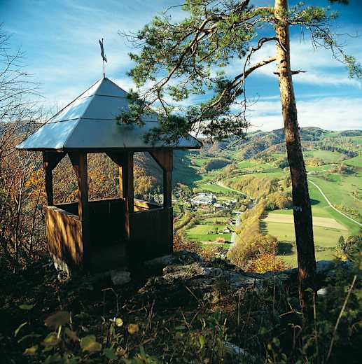 Vom Fahrweg ab und auf Serpentinensteig über eine bewaldete Steilflanke nach Südosten empor an den Rücken des Hauswaldberges. Dort rechts hinaus zu dem auf einem Felsen stehenden Parapluie der Leopoldswarte, 576 m (Kreuz und Buch). Blick in das Pielachtal und zum Ötscher.